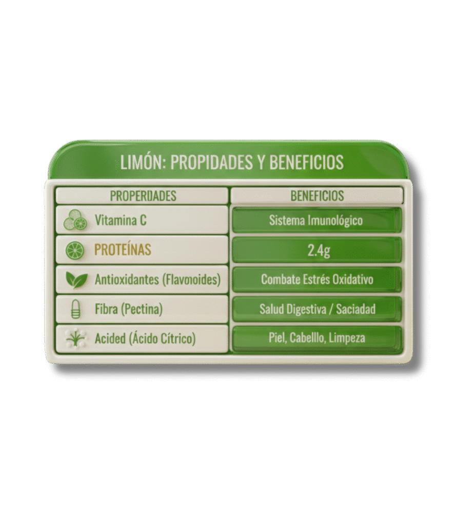 El limón es una fruta cítrica rica en vitamina C, antioxidantes y flavonoides, reconocida por ser un antibiótico natural que refuerza el sistema inmunológico. Sus principales propiedades incluyen la capacidad de mejorar la digestión, alcalinizar el pH corporal, prevenir cálculos renales y promover la absorción de hierro, además de ofrecer beneficios depurativos y cardiovasculares.